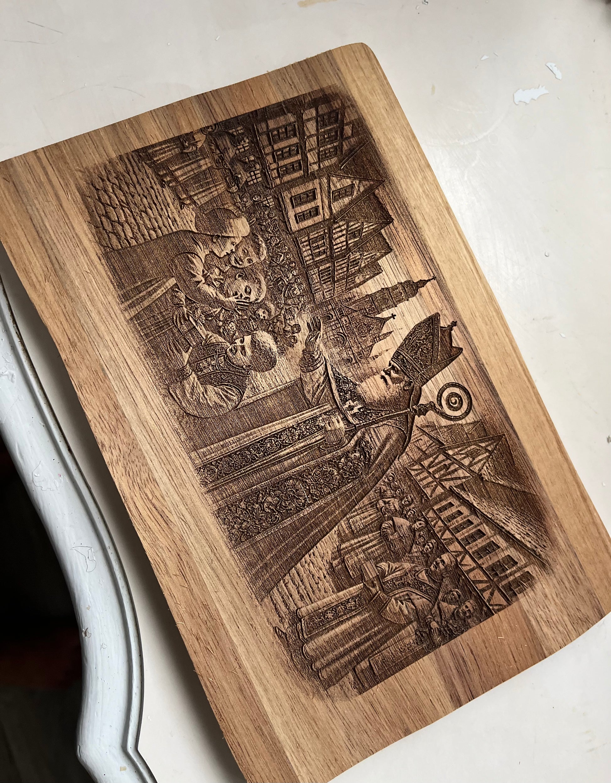 This little dainty tray give vintage vibes! Super nostalgic depiction of St. Nicholas with the orphans bestowing gifts & joy are sure to bring a smile to your face every Christmas season. Add fudge for a splendid gift for neighbors or family to jazz this engraved acacia wood tray up to an elevated aesthetic!